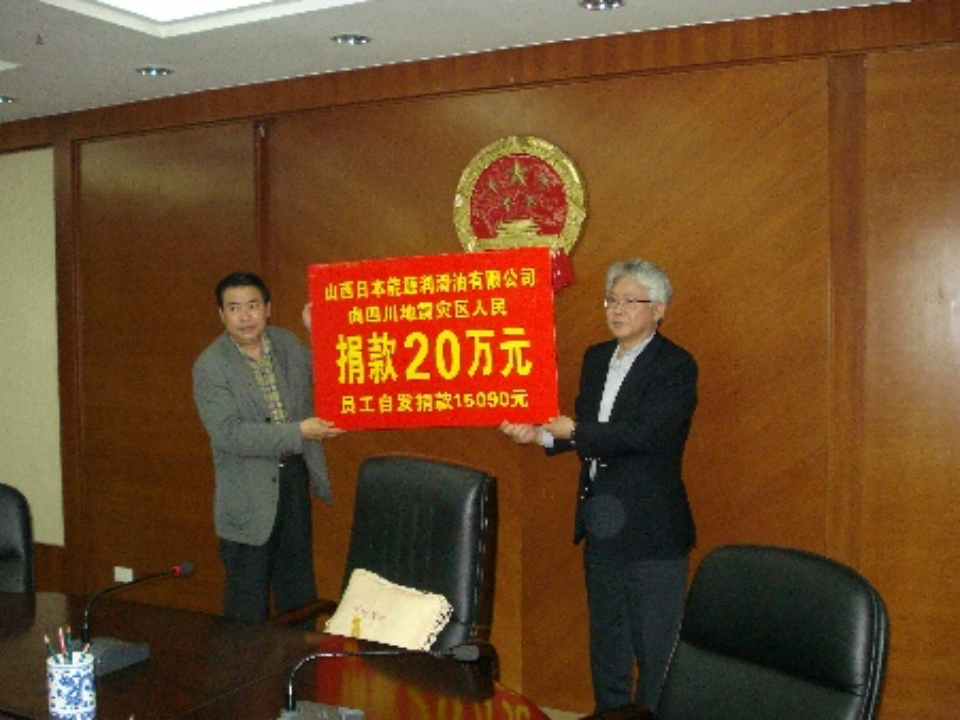 新日礦、日本能源、日礦金屬為四川省地震受災(zāi)者捐款1000萬日元。山西日本能源捐款20萬元,并為災(zāi)區(qū)免費(fèi)贈油,員工也積極籌善款。